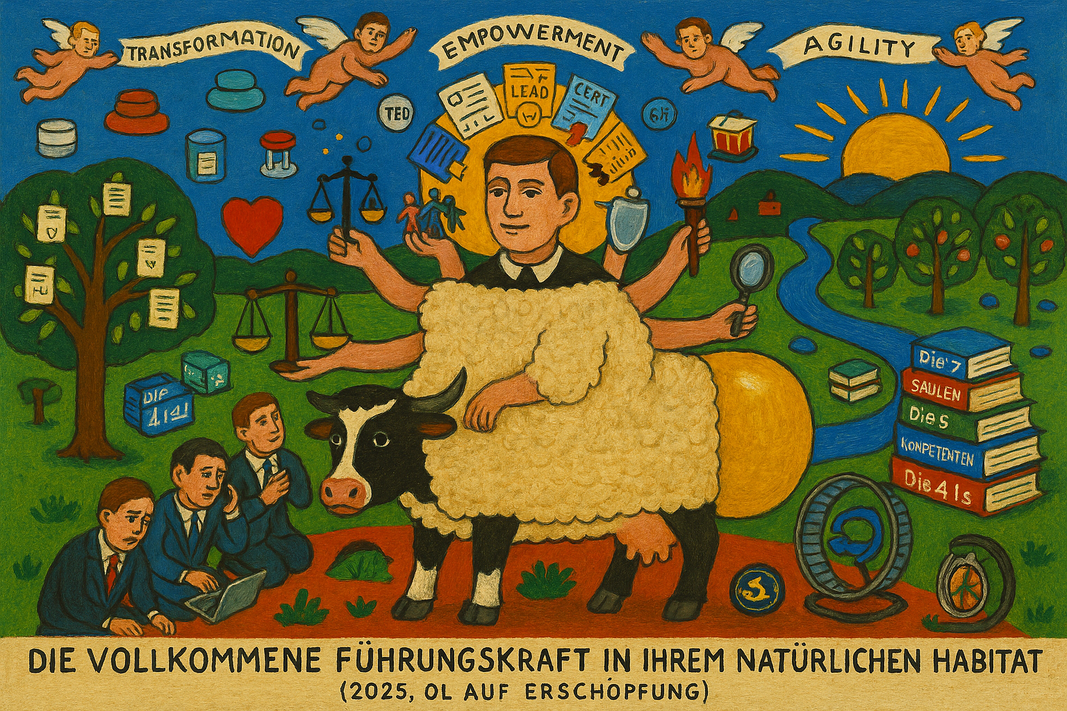 Sie verwandelt, während sie kommuniziert. Inspiriert, während sie delegiert. Coacht individuell – selbstverständlich unter Berücksichtigung kultureller Hintergründe, neurodivergenter Perspektiven und unterschiedlicher Biografien –, während sie strategisch denkt. Ihr emotionaler Intelligenzquotient liegt naturgemäß im obersten Zehntel, ihre Widerstandskraft steht bombenfest, ihre Wandlungskompetenzen sind durchweg im grünen Bereich validiert. Sie praktiziert situative Führung, dienende Führung, agile Facilitierung – je nachdem, was die Situation erfordert, wechselt sie mühelos zwischen den Modellen.